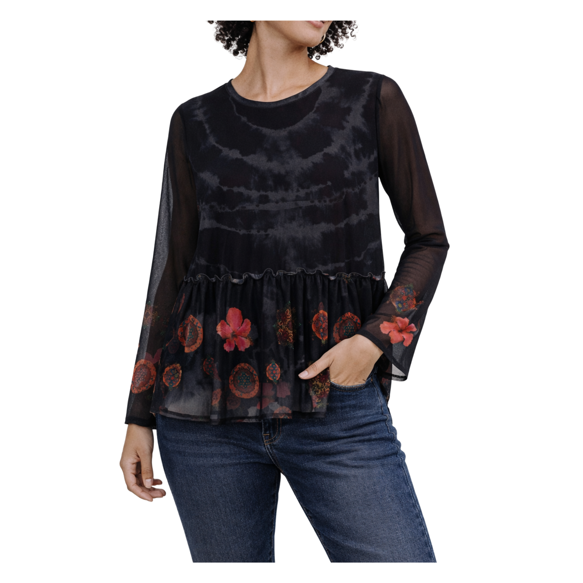 Hosszú ujjú női blúz a Desigualtól. Szín: Fekete, virágmintás. Méret: S. EAN: 8445110016350